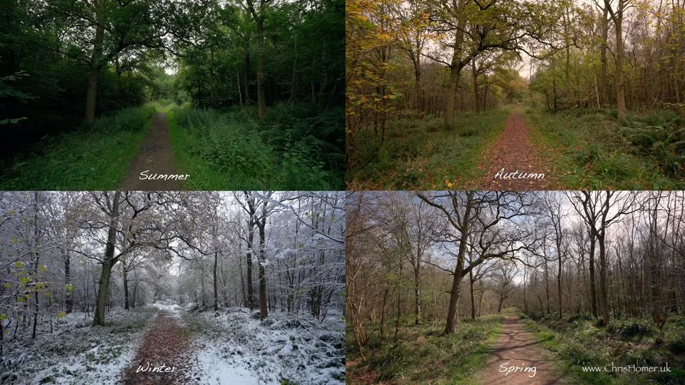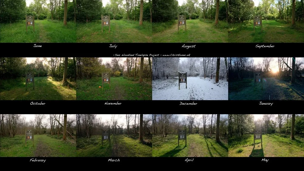 1 - Welcome to Uffmoor: The entrance to one of my favourite woodlands, showing the seasons around the Woodland Trust sign. You can clearly see the grass gets cut around this sign, and in particular, how after Halloween, a few pumpkins suddenly appear! Maybe for the squirrels? Over the winter, a tree falls on the right of the frame.