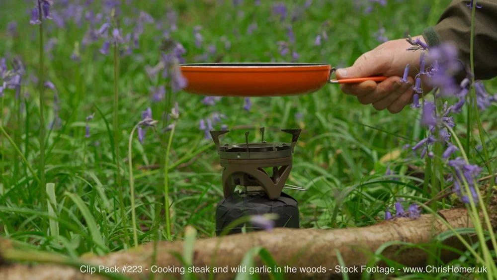 Wilderness Cooking: Captures me cooking steak and wild garlic in a frying pan with butter on a gas stove. This is "unreal" and truly portrays living the good life amidst bluebells and majestic woodland.