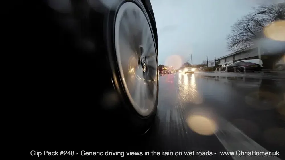 A collection of 11 high-quality 4K UHD clips showcasing various driving scenes on wet British roads in the rain. This 4-minute 27-second stock footage pack (1.76GB) includes a mix of driver’s POV shots, close-ups of wheels splashing through puddles, and traffic moving through rainy conditions.