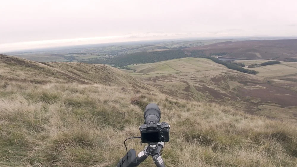 The Cinematic Wide-Angle Sequence: The primary timelapse setup utilised the Sony A7iii camera (Timelapse camera - https://amzn.to/4mBQ39o) locked down on a Benro 35C Tripod tripod. The lens of choice was the 50mm f1.4 lens (The 50mm Lens - https://amzn.to/46MClKH). This focal length provided the perfect sense of scale, contrasting the immediate Peak District foreground with the miniature, distant urban sprawl.