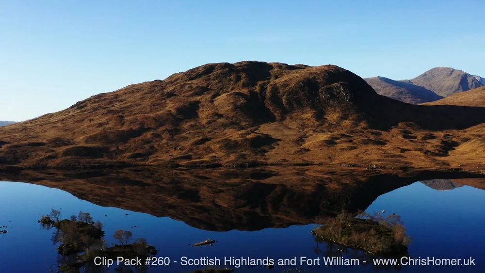 Clip Pack #260 - Scottish Highland Scenes and Fort William Stock Footage At £795, this pack contains 53 clips, offering 14 minutes 52 seconds of 4K UHD footage (5.94GB). It’s a stunning collection of Scottish Highlands scenes and drone shots of Fort William. The footage captures gorgeous mountains with snow-capped summits, sunlit green slopes, blue skies, deep valleys, and dramatic deep shadows. You'll see roads winding through the mountains and landscape with cars driving, and picturesque lakes (lochs) with mirror reflections of the Scottish landscape. Highlights include gorgeous views over Loch Linnhe and its water, as well as harbours and boats. The pack also features drone shots of Fort William itself, including views of the majestic, snow-covered Ben Nevis mountain, the tallest in the UK. Perfect for establishing views, this pack delivers amazing Scottish scenery and beautiful Scotland stock footage.