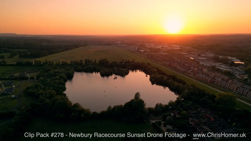 Clip Pack #278 - Newbury Racecourse Sunset Drone Footage At £395, get 8 minutes 44 seconds of 4K UHD sunset drone stock footage across 13 clips (3.44GB). This pack captures breathtaking aerial views of Newbury Racecourse bathed in the golden hues of sunset as a summer evening fades into night. The footage highlights the round course and straight mile looking magnificent, with the clear sky illuminated orange and red. The nearby lake looks stunning, surrounded by trees, and nearby houses glisten in the sun. Aerial perspectives include wide shots, orbits, and views of the horse racing course and grandstands.