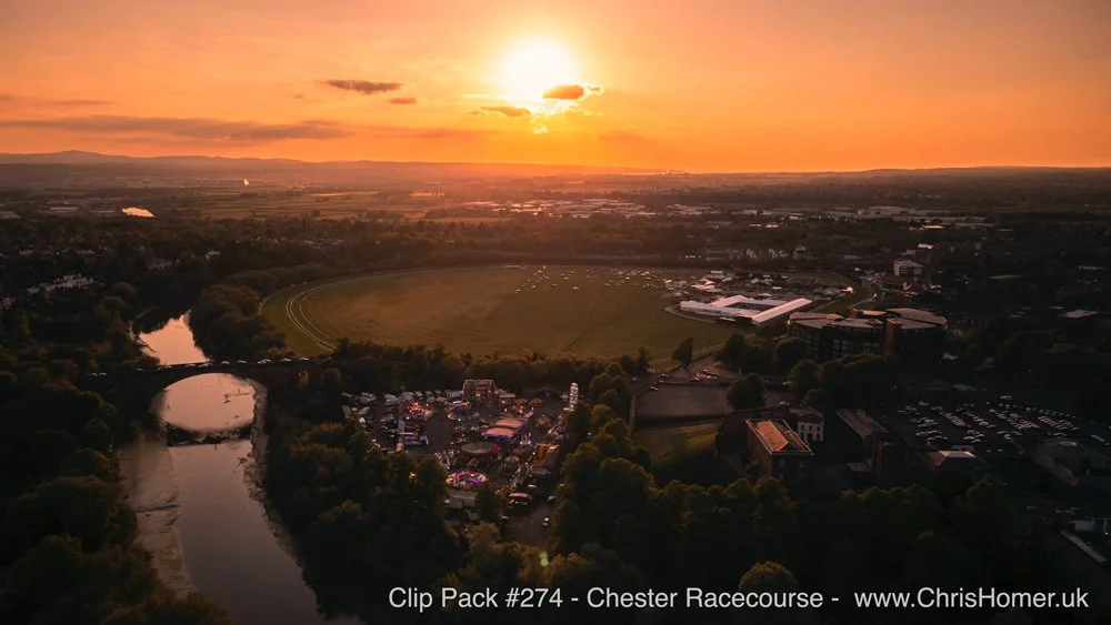 The drone timelapses are incredible, capturing traffic flowing around the racecourse, clouds passing overhead, and a stunning sunset over the River Dee with magnificent puff of cloud. The tripod timelapses vividly portray racegoers leaving the races, flooding the old cobbled streets of Chester like a tidal wave, conveying a real sense of excitement and motion as they head towards a night in the city. The drone video clips showcase Chester Racecourse in all its magnificence: the circular racetrack looks fantastic next to the River Dee, alongside the grandstands and the historic Chester City Walls. The horse racetrack is wonderfully green. Views extend to Chester city centre in the background, including Grosvenor Bridge. You'll find views looking down at the racecourse as it follows the River Dee, and the nearby railway line with shots of a passing train. A variety of amazing sunset scenes as the sun dips behind Chester Racecourse, with the River Dee winding into the distance, are also included, with the fairground visible in the foreground.