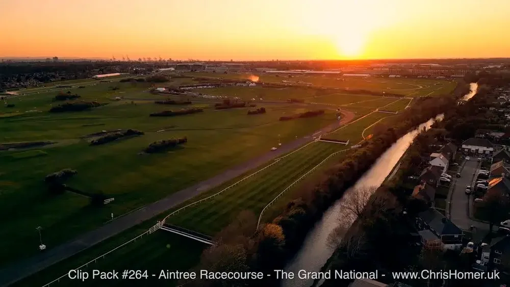 Aintree Racecourse (The Grand National): Experience the iconic Aintree Racecourse with Clip Pack #264 - Aintree Racecourse, The Grand National Stock Footage (44 clips, 25 minutes 27 seconds), capturing the venue's preparation for the Grand National, including Becher's Brook and Foinavon, with breathtaking sunset views.