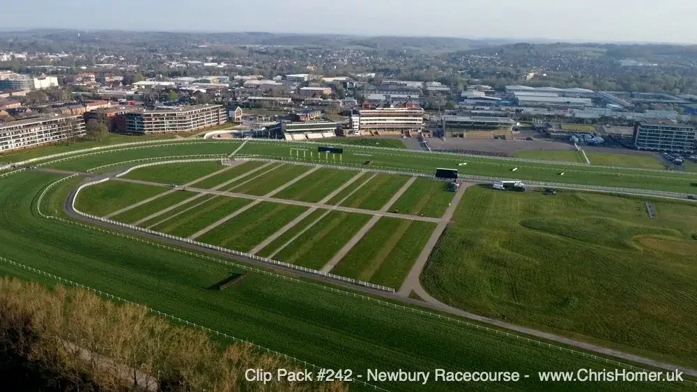 Clip Pack #242 - Newbury Racecourse Drone Stock Footage: This pack offers 18 clips of 4K UHD drone footage, totalling 6 minutes and 26 seconds. It focuses on wide aerial views, establishing shots, and dynamic orbits of the racecourse under great light and lush green conditions.