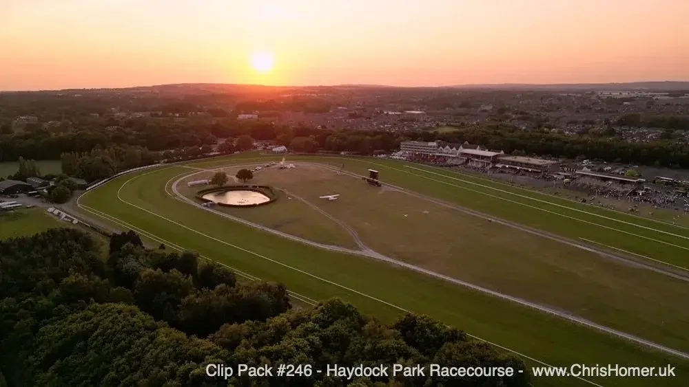 Haydock Park Racecourse: Get wide, establishing aerial views of Haydock Park Racecourse with Clip Pack #246 - Haydock Park Racecourse Drone Stock Footage (16 clips, 8 minutes 14 seconds), including stunning daylight and sunset shots.