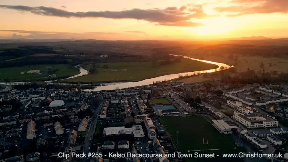 Kelso Racecourse (Scotland): Discover the beauty of Kelso Racecourse with Clip Pack #255 - Kelso Racecourse and Town Sunset Drone Stock Footage (22 clips, 13 minutes 21 seconds), showcasing stunning sunset and dusk views over the course and River Tweed.