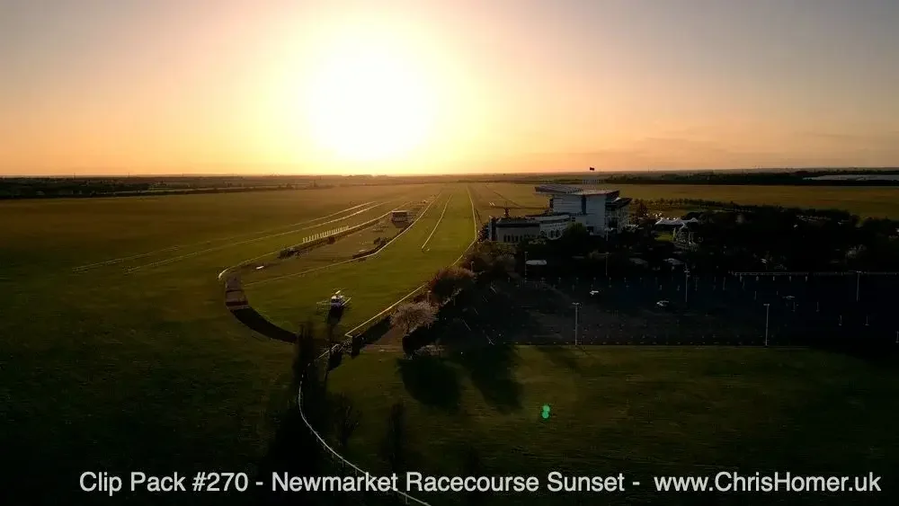 Newmarket Racecourse: Discover the home of horse racing with Clip Pack #133 - Newmarket Racecourse, Town Centre & Warren Hill Drone Stock Video Footage (72 clips, 28 minutes 41 seconds), featuring extensive drone footage of the racecourse, town centre, and the spectacular Warren Hill gallops under incredible sunrise light. For pure sunset magic, Clip Pack #270 - Newmarket Racecourse Sunset Stock Footage (16 clips, 9 minutes 40 seconds) captures the Rowley Mile course under a stunning evening sky.