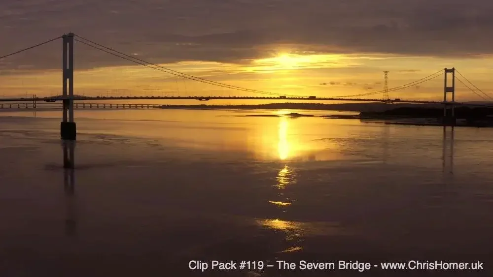 Clip Pack #119 – The Severn Bridge - Stock Video Footage: This pack (18 minutes 33 seconds, 55 clips) captures the iconic Severn Bridge, a vital landmark on the river's lower reaches. It features breathtaking sunset shots with light piercing through the bridge’s architecture, reflections on the muddy sandbed, and smooth orbits. It also includes daylight footage with clear blue skies, offering detailed close-ups of this engineering marvel.