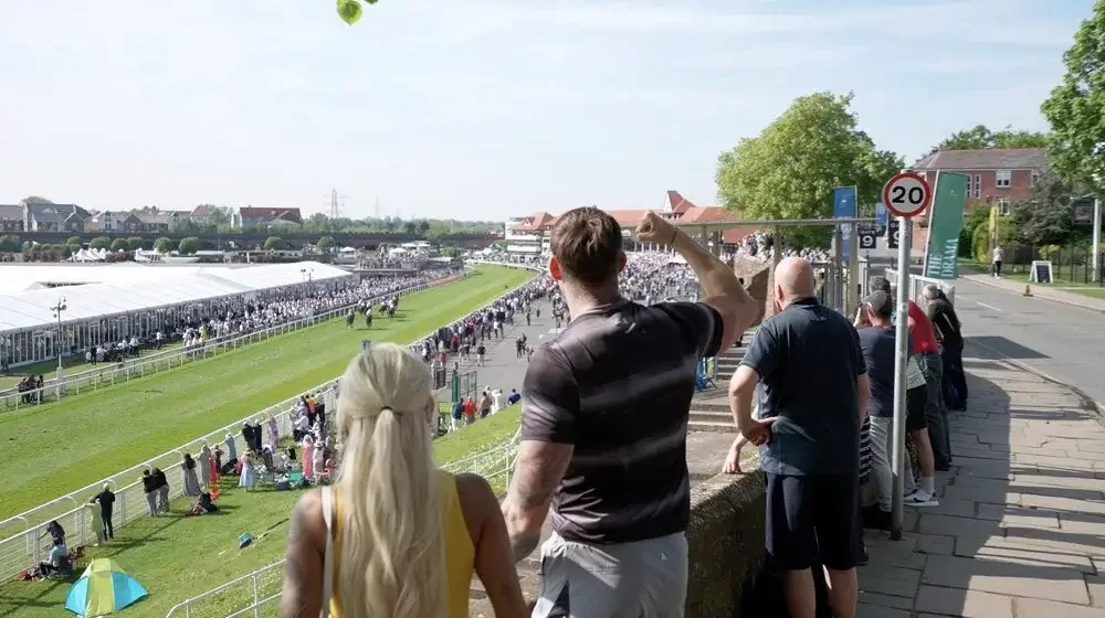 Cinematic shots of Chester’s iconic racecourse, including aerial views of the city and dynamic crowd shots, ideal for event coverage and sports films.