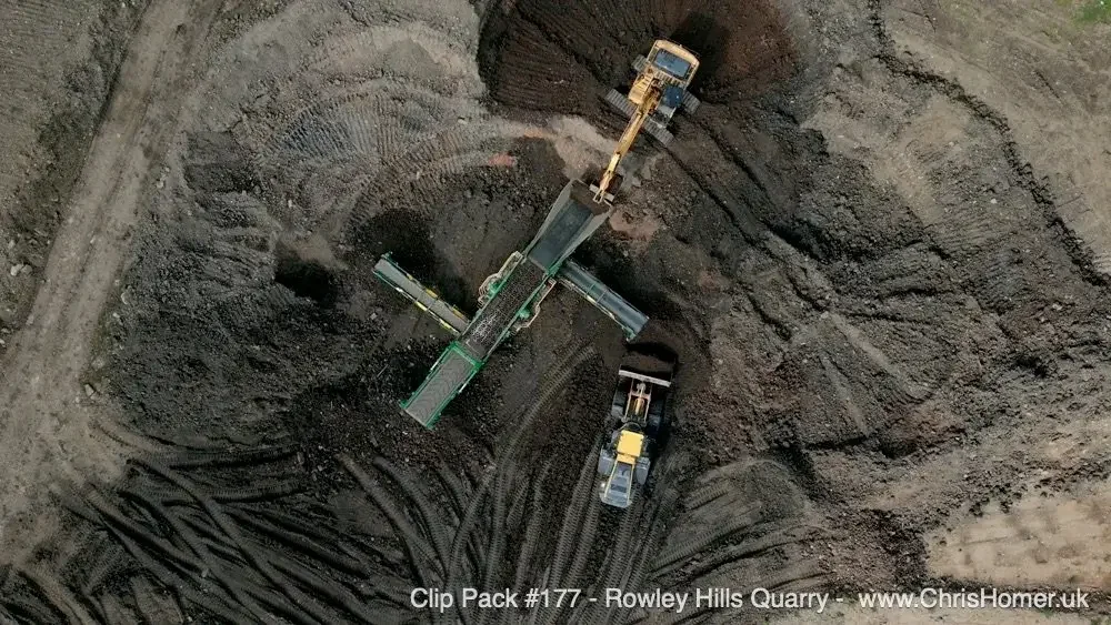 Quarry Operations: Extensive drone shots capturing huge earthworks, digging, dusty roads spiralling deep into the quarry, top-down views, and wide establishing shots. Features tracked diggers and wheeled dumpers relentlessly working together. Includes shots of diggers laying vast amounts of soil (reportedly sourced from major infrastructure projects like HS2), trucks being weighed at the weighbridge, and a dust suppression bowser hard at work.