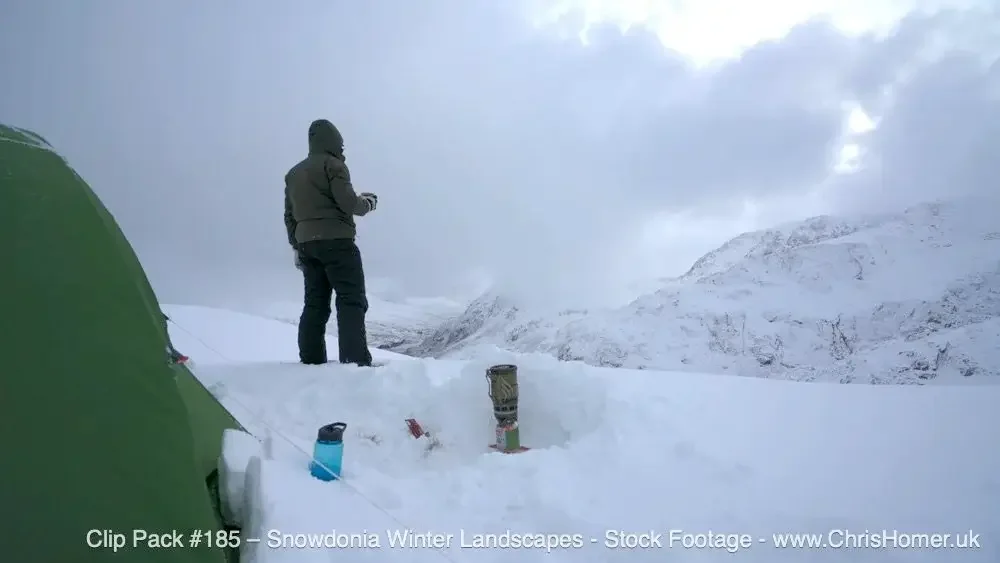 Clip Pack #185 - Winter Camping in Snowdonia: (231 clips) Showcases the Glyderau range transformed by heavy snow and ice. Includes drone footage of frozen lakes and peaks, plus intense ground footage of winter hiking and wild camping in extreme conditions. Provides a stark seasonal contrast to the footage in Pack #188.