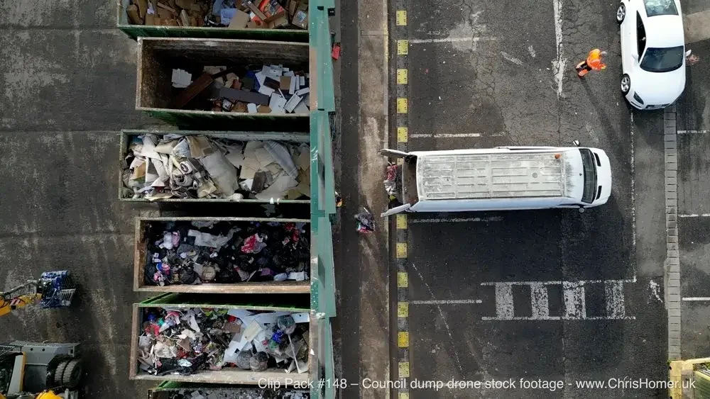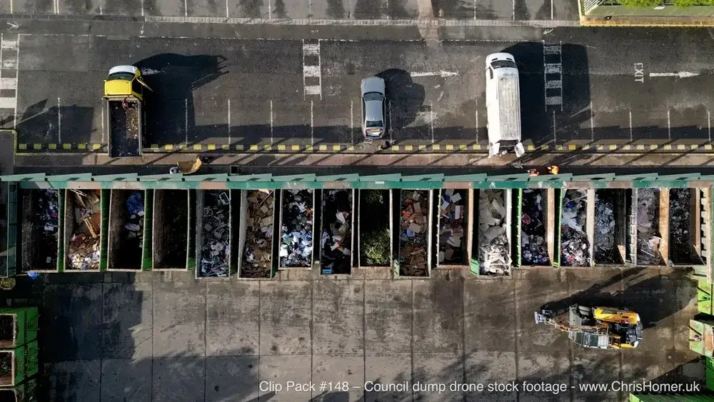 Council Rubbish Dump and Recycling Centre Drone Stock Footage For a direct look at waste management from an aerial perspective, Clip Pack #148 offers 13 clips, totalling 6 minutes and 4 seconds of 4K UHD footage. This pack provides a captivating aerial look at a council rubbish dump and recycling centre, including wide orbits and detailed close-ups of people recycling and disposing of rubbish. A drone timelapse sequence beautifully documents the ebb and flow of recycling activities, making it perfect for documentaries or educational films focused on sustainability and waste management.