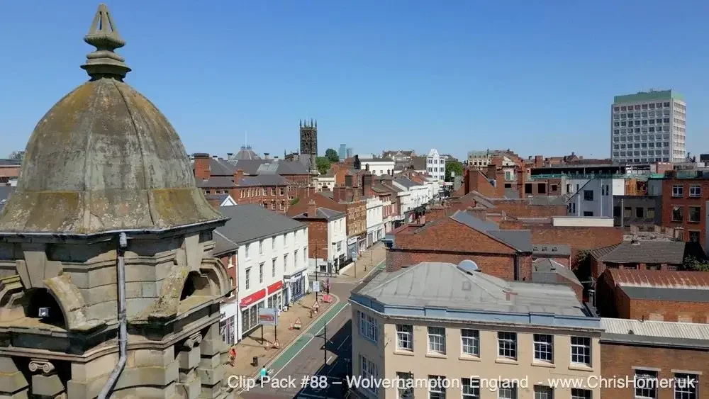 Wolverhampton, England – Stock Video Footage Expanding on West Midlands urban centres, Clip Pack #88 offers 58 drone clips, totalling 20 minutes 26 seconds of footage and 8.18GB in size. It provides a comprehensive collection showcasing Wolverhampton in stunning 4K quality. The pack features newly filmed drone clips, capturing establishing views of Wolverhampton from unique perspectives, exploring the city's evolving skyline, streets, traffic, and buildings. Beautiful old churches stand as historic landmarks, and the famous Banks's Brewery and distant views of Molineux Stadium are also included.