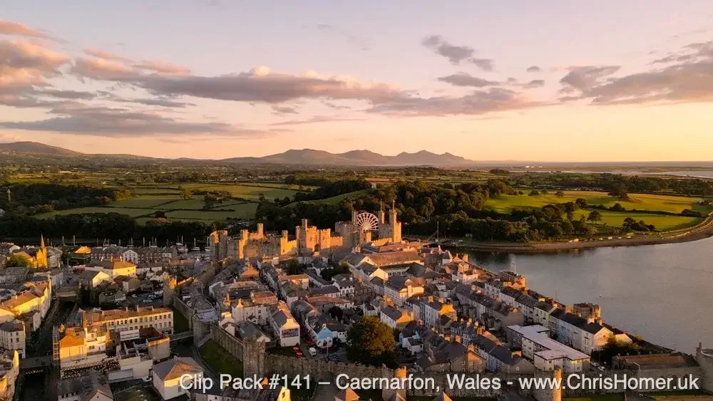 For a truly iconic Welsh castle, Clip Pack #141 provides 32 minutes 37 seconds of 4K drone footage across 50 clips, capturing the essence of Caernarfon. The collection features breathtaking aerial views of the towering Caernarfon Castle, a UNESCO World Heritage site, with dramatic shots at sunrise, sunset, and night. The castle is a constant focal point, showcasing its grandeur and historical significance, offering a powerful comparison to Warwick Castle's architectural and historical prominence.